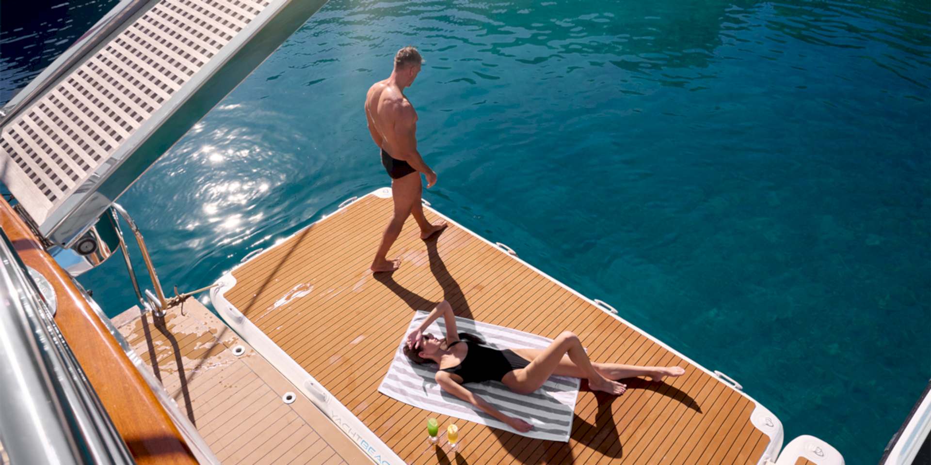 The yacht’s generous swim platform invites guests to dive into the crystal-clear waters during the day and transforms at dusk into a romantic, candlelit dining area under the stars — an unforgettable way to end a perfect day at sea.