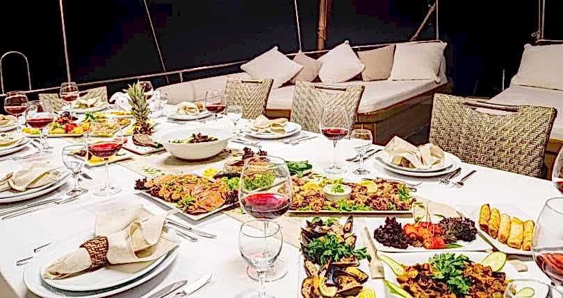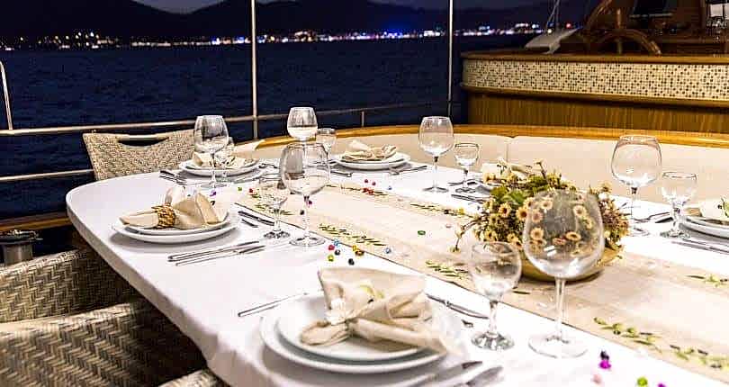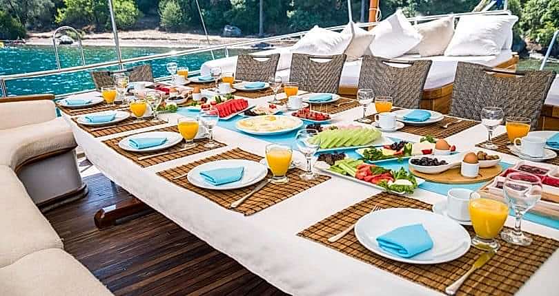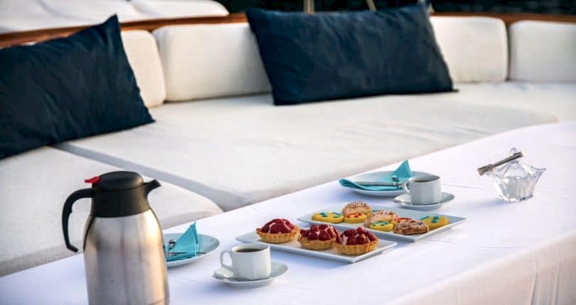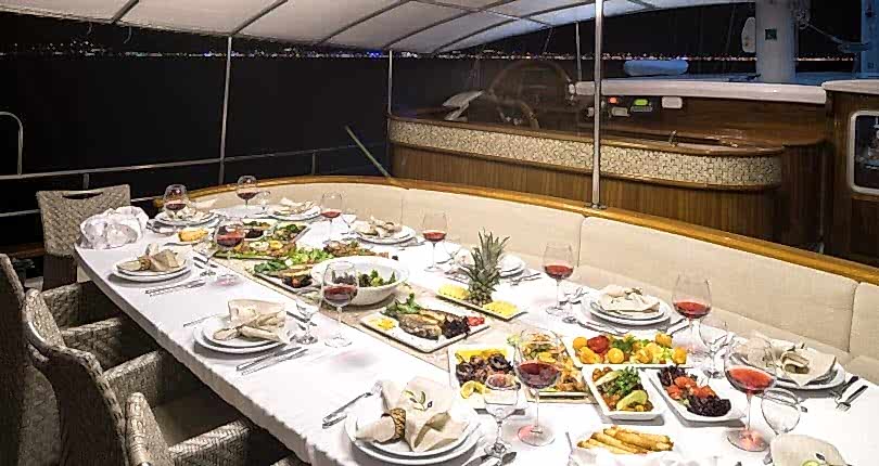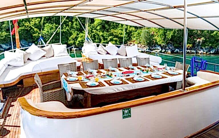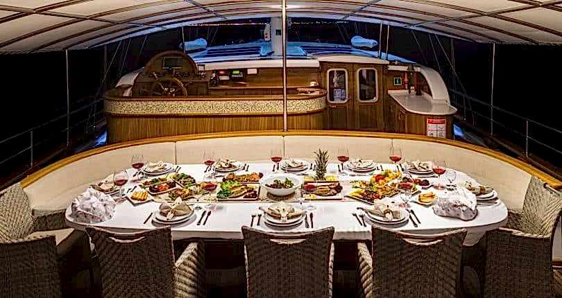 Gölgeli kıç, kıç tarafı çevreleyen büyük yastıklarla döşenmiştir ve birçok unutulmaz sosyal toplantı ve lezzetli Akdeniz yemeği, maun ağacından yapılmış büyük oval ahşap bir masanın etrafında, tik sandalyelerle çevrili açık havada deneyimlenebilir. Ayrıca, konukların S. Nur Taylan’daki seyahatleri sırasında serin ve ferahlatıcı içeceklerin tadını çıkarabilecekleri tam hizmet veren bir bar da bulunmaktadır. Yemekler muhteşemdir. Her gün taze olarak hazırlanan, birçok damak tadına hitap eden geniş bir yelpazeye sahip Türk Akdeniz mutfağı.