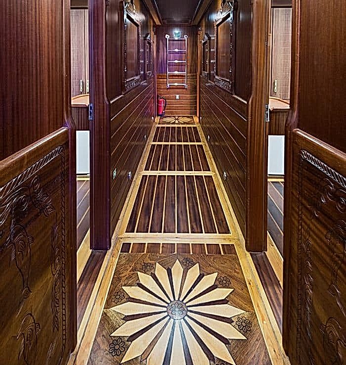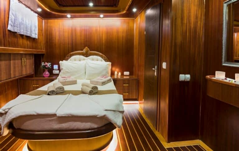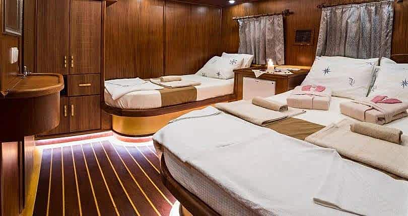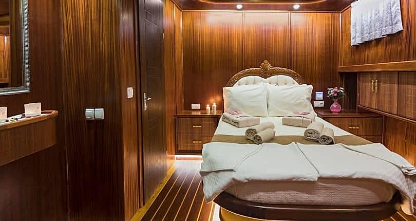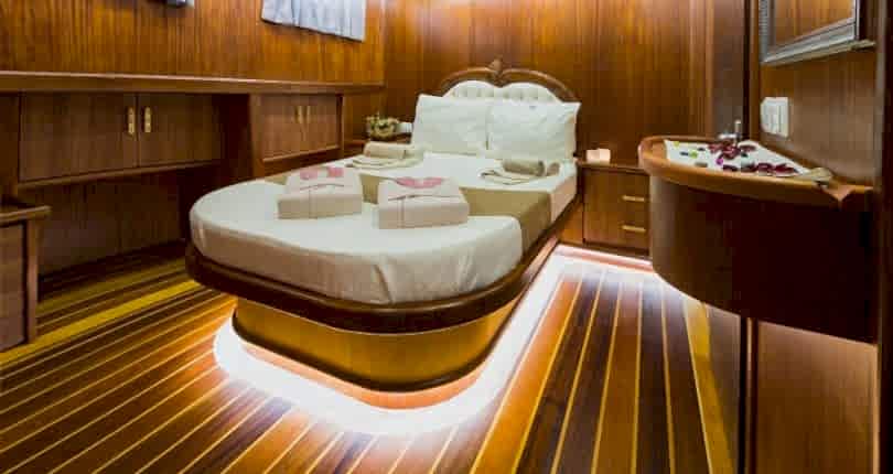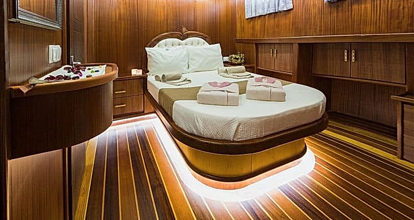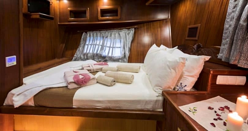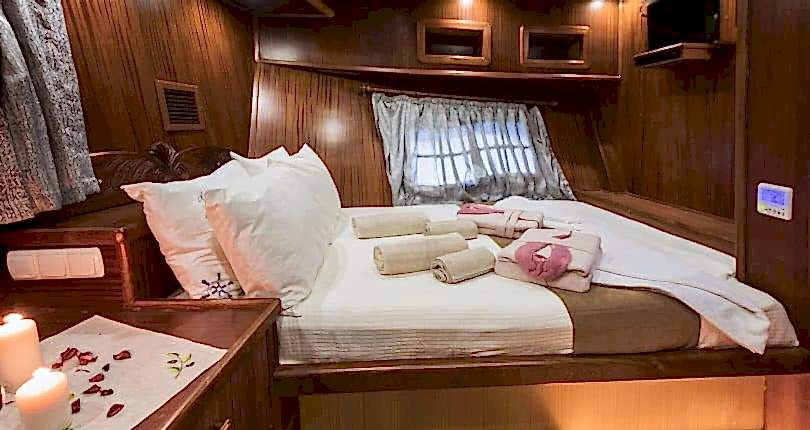 Ön güverte 8,4 metrelik geniş bir kirişe sahiptir. Konukların güneşlenme minderleri ve masalı hilal şeklinde bir oturma alanı ile keyif alabilecekleri mükemmel bir sosyal dinlenme alanı. Ön güvertenin her iki bölümü de konukların isteği üzerine gölgede olabilir. Her yaştan birçok grup türüne hitap eden harika bir büyük veya küçük grup kiralama guleti. Tüm kabinler geniştir ve kasa, mini buzdolabı, klima ve duş kabinli bakımlı banyolarla kullanışlı bir şekilde döşenmiştir.